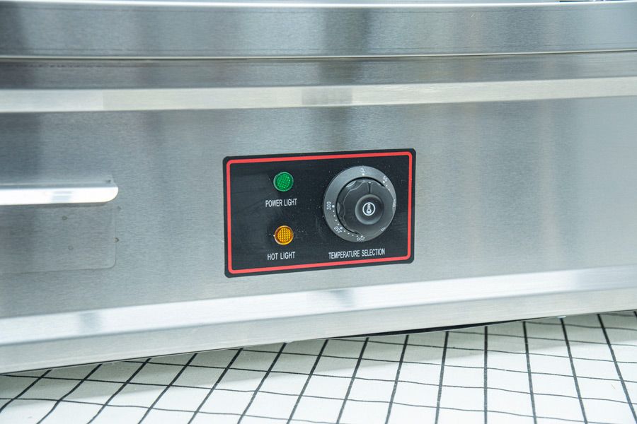 -Bộ điểu khiển bếp nhúng bao gồm: 1 núm điều chỉnh nhiệt độ từ 60 - 200°C, 1 đèn báo nguồn và 1 đèn báo nhiệt.