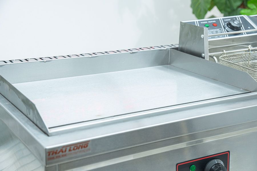 Mặt chiên phẳng: làm bằng tấm inox dày 8mm, mang lại khả năng lên nhiệt nhanh chóng, hạn chế việc quá nhiệt làm cháy thực phẩm hay khiến thực phẩm bám dính vào bề mặt chiên.