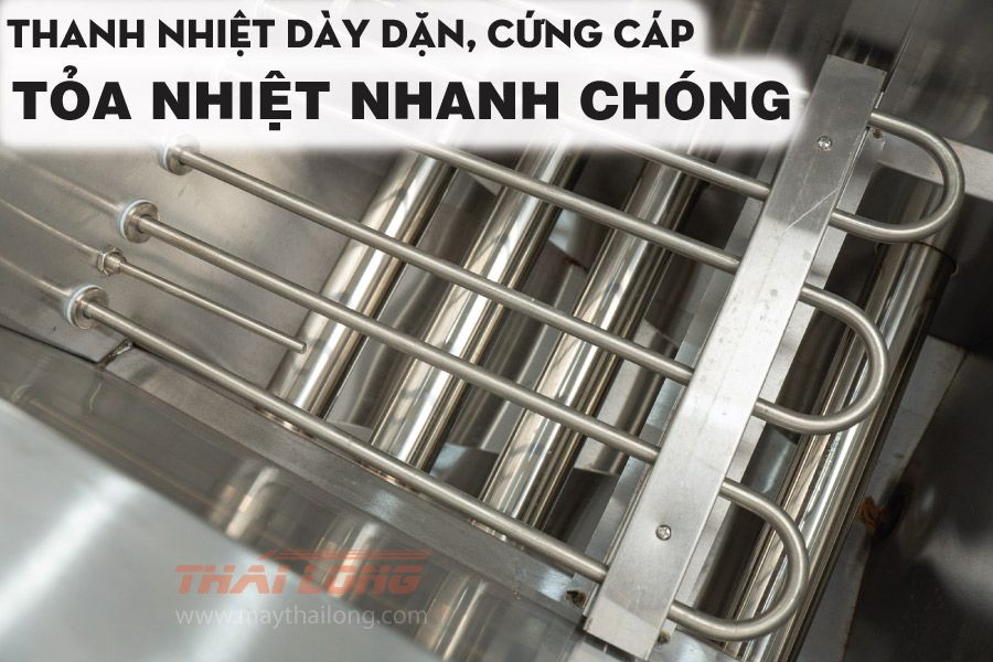 Thanh nhiệt dạng chữ U tăng diện tích tiếp xúc với khoang chiên. Công suất thanh nhiệt tương đối lớn 7500W. Bếp sử dụng nguồn điện dân dụng 220V – 50Hz