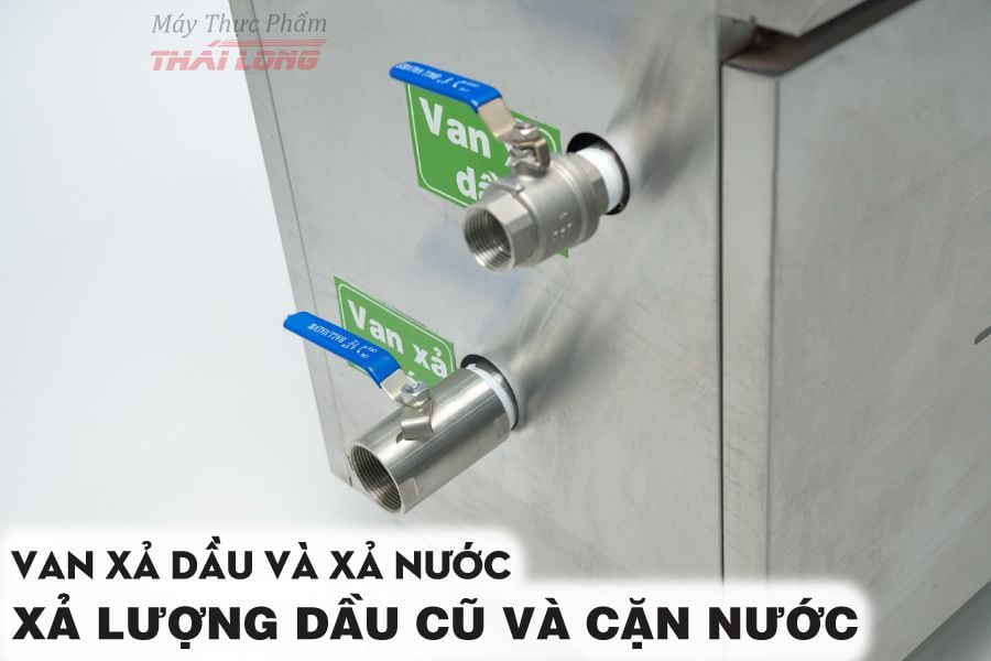 Van xả dầu và van xả nước thiết kế ngay thân bếp rất tiện cho việc thay nước, thay dầu và vệ sinh bếp.