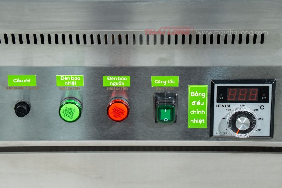 Bảng điều khiển bao gồm: cầu chì, đèn báo nhiệt, đèn báo nguồn và bảng điều chỉnh nhiệt