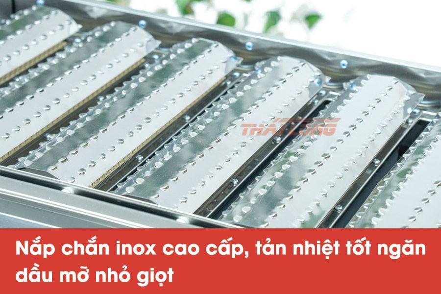 Nắp chắn thanh gốm của bếp được làm bằng inox chất lượng cao, giúp tản nhiệt hiệu quả khi nướng thức ăn và bảo vệ các thanh gốm khỏi lớp dầu mỡ rơi xuống, giảm thiểu khói bụi và kéo dài tuổi thọ của các thanh gốm. Điều này giúp cho việc sử dụng bếp nướng trở nên an toàn và tiện lợi hơn, đồng thời giảm thiểu tác động đến môi trường.