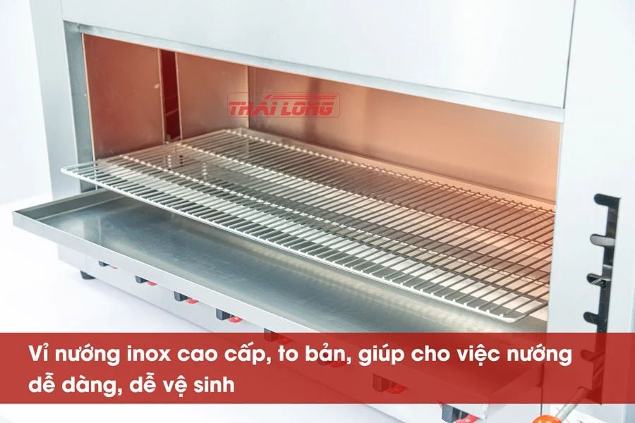 Vỉ nướng toàn bộ của lò được làm bằng inox chất lượng cao, có kích thước lớn và cấu trúc chắc chắn, tạo điều kiện thuận lợi cho việc nướng thực phẩm. Khay hứng dầu mỡ cũng làm từ inox, dễ dàng vệ sinh sau khi sử dụng, đảm bảo an toàn và vệ sinh cho thực phẩm.