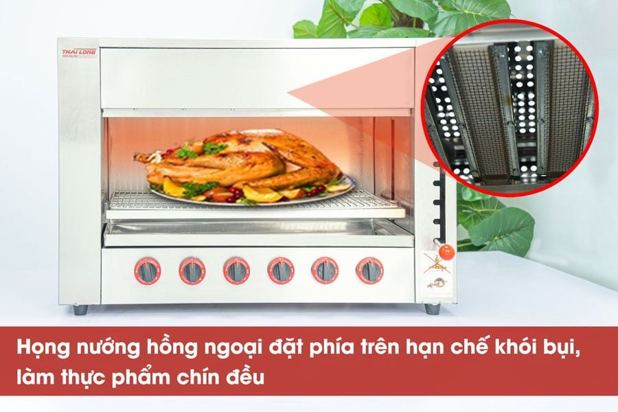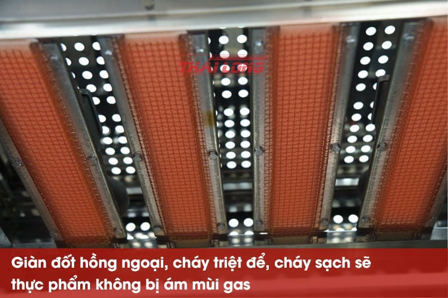 Với cách bố trí các giàn đốt ở phía trên giúp phân phối nhiệt một cách đều từ trên xuống dưới, tạo điều kiện cho thực phẩm tiếp xúc với nhiệt một cách đồng đều. Điều này cũng loại bỏ được hiện tượng dầu mỡ rơi vào giàn đốt, giúp thực phẩm nấu chín đều và hấp dẫn đặc biệt là không tạo ra khói.