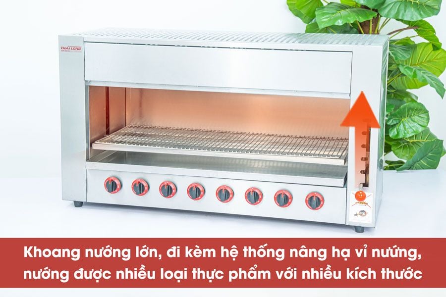 Khoang nướng của lò nướng có kích thước 90 x 38 x 27 cm và được trang bị hệ thống nâng, hạ vỉ nướng với tay cầm, cho phép nướng một loạt các loại thực phẩm, từ tôm hùm, hàu đến chả, thịt, và sườn nướng, với đa dạng kích cỡ.