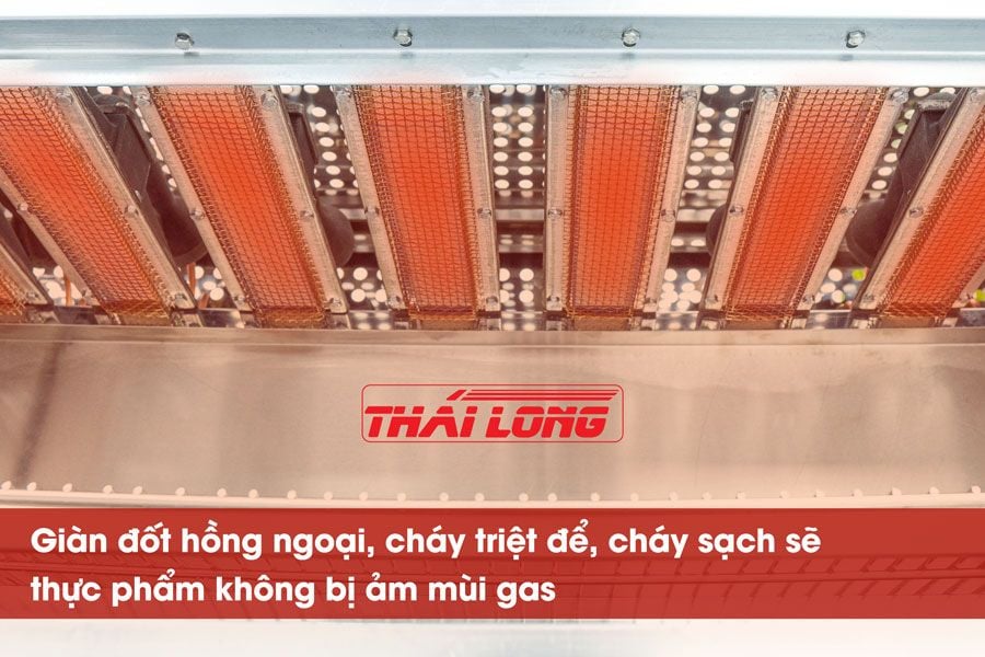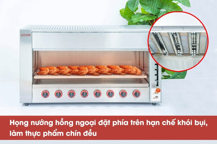 Bằng cách bố trí các giàn đốt ở phía trên, lò nướng được thiết kế để phân phối nhiệt đều xuống phía dưới, tạo điều kiện cho thực phẩm tiếp xúc với nhiệt một cách đồng đều. Điều này không chỉ ngăn chặn hiện tượng dầu mỡ rơi vào giàn đốt gây ra khói bụi mà còn đảm bảo thực phẩm được nấu chín đều, hấp dẫn.