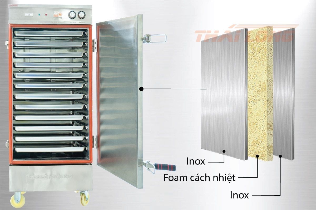 Cách nhiệt 3 lớp: Lớp Foam giữ nhiệt ở giữa giúp tủ giữ nóng lâu, đồng thời vỏ ngoài không bị nóng, an toàn cho người đứng bếp.